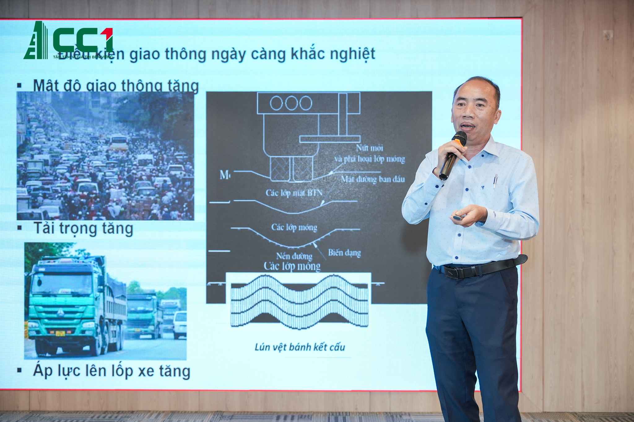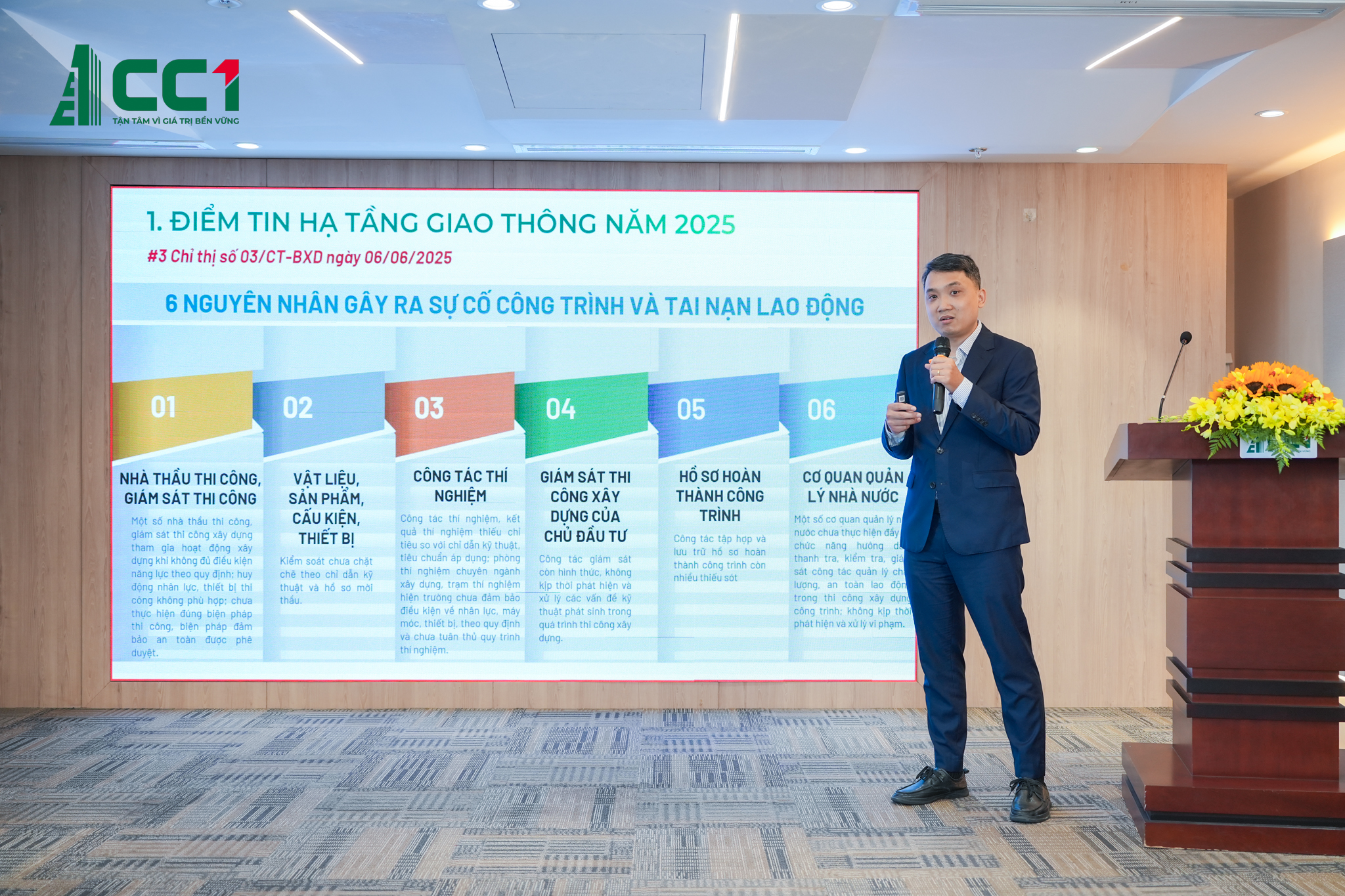 Ông Trần Văn Pha – Giám đốc Điều hành Xây lắp CC1 trình bày tham luận “Nâng cao hiệu quả phối hợp và kiểm soát chất lượng trong thi công đường bộ: Thực trạng và giải pháp”