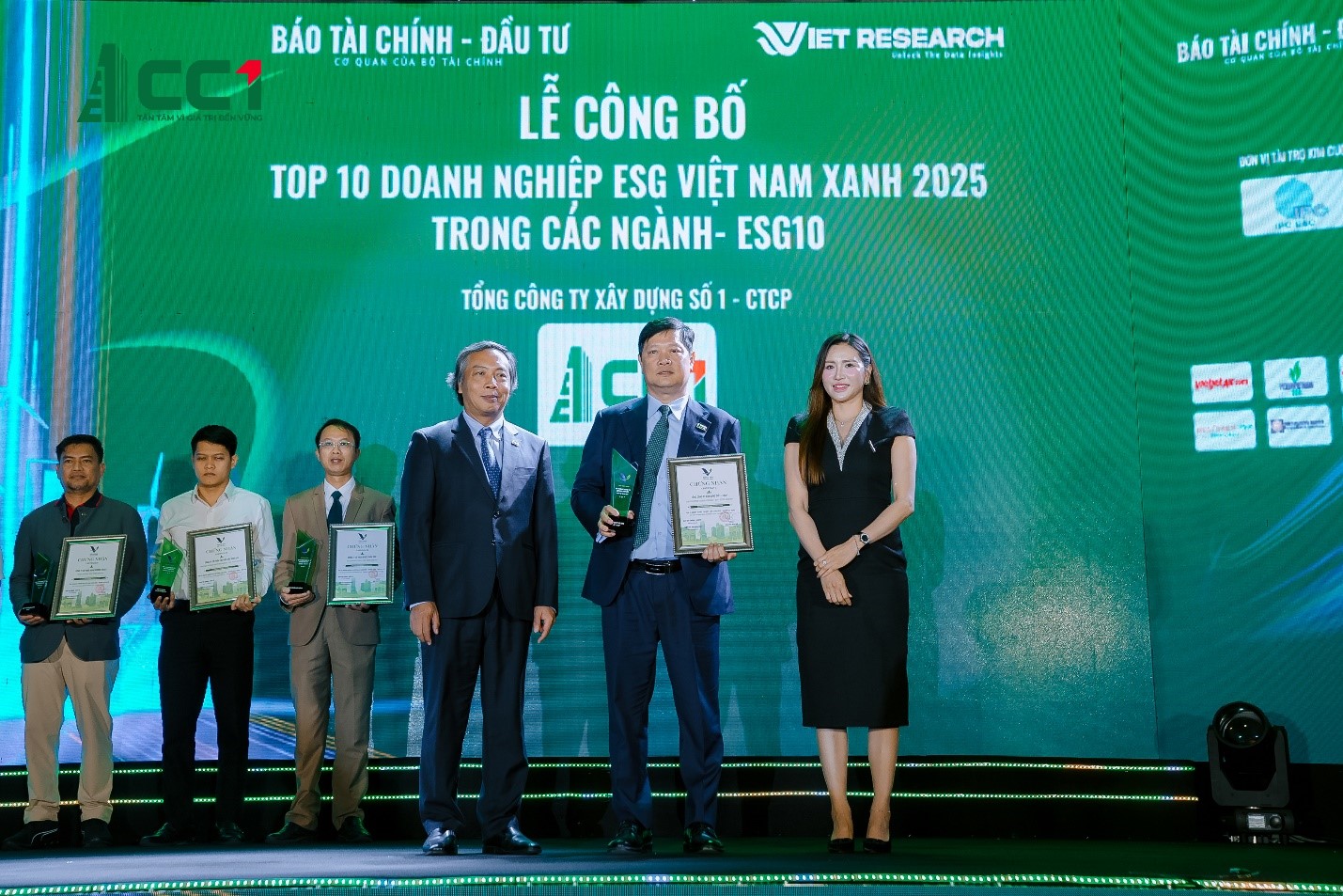Ông Phan Hữu Duy Quốc – Chủ tịch HĐQT CC1 đón nhận cúp và giấy chứng nhận Top 10 Doanh nghiệp ESG Việt Nam Xanh 2025 – Ngành Xây dựng (ESG10)