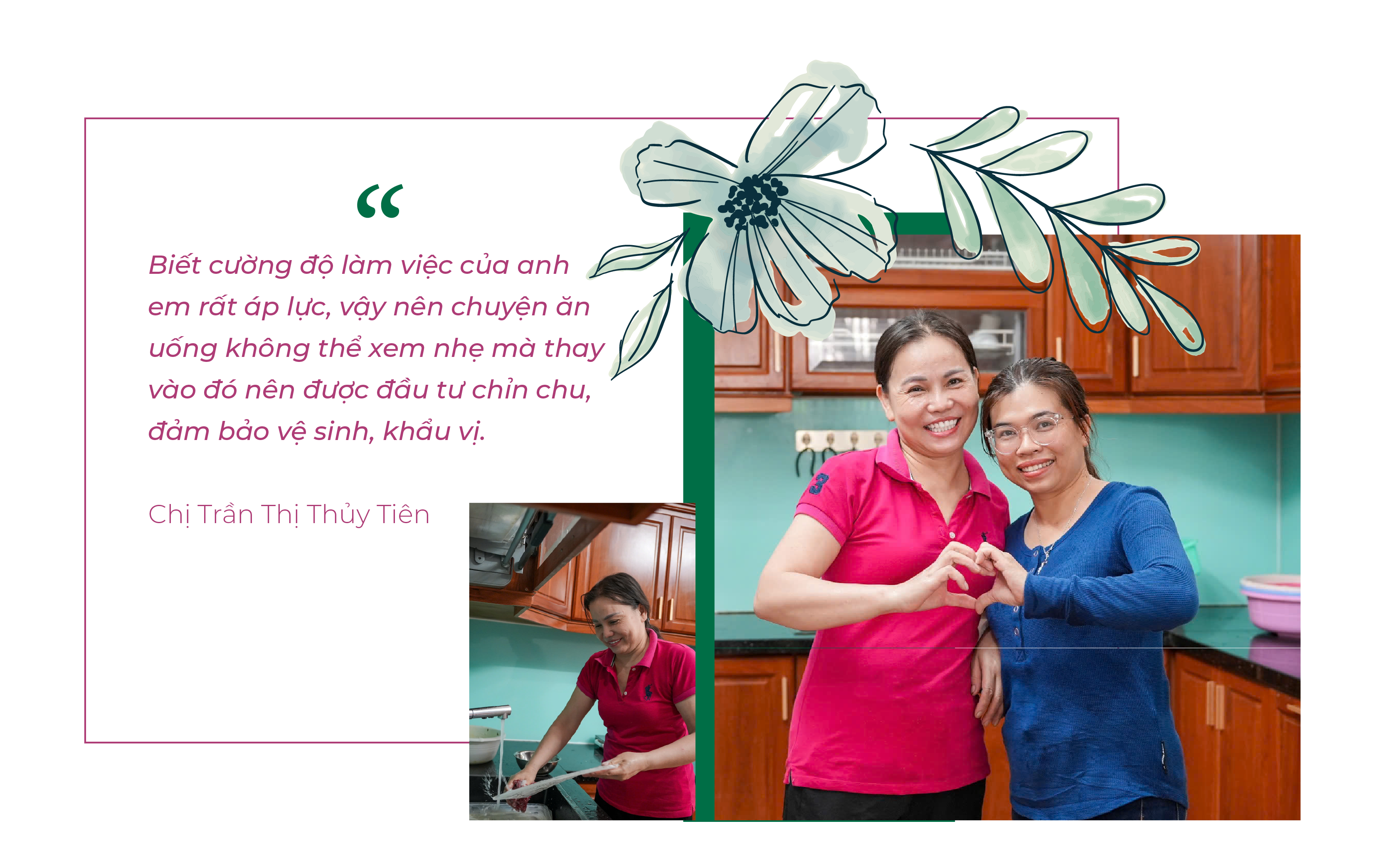 “Thiếu sao được những món ăn có thực đơn đa dạng được thay đổi hằng ngày. Tôi thích nhất là món bún riêu của chị Tiên và chị Linh nấu. Họ nhớ từng sở thích ăn uống của mỗi người và sẵn sàng làm thêm giờ để phụ giúp anh em ở nhà ban điều hành khâu vệ sinh ăn uống, dọn dẹp nhà cửa sạch sẽ”, chị Mỹ Nhung vui vẻ nói.