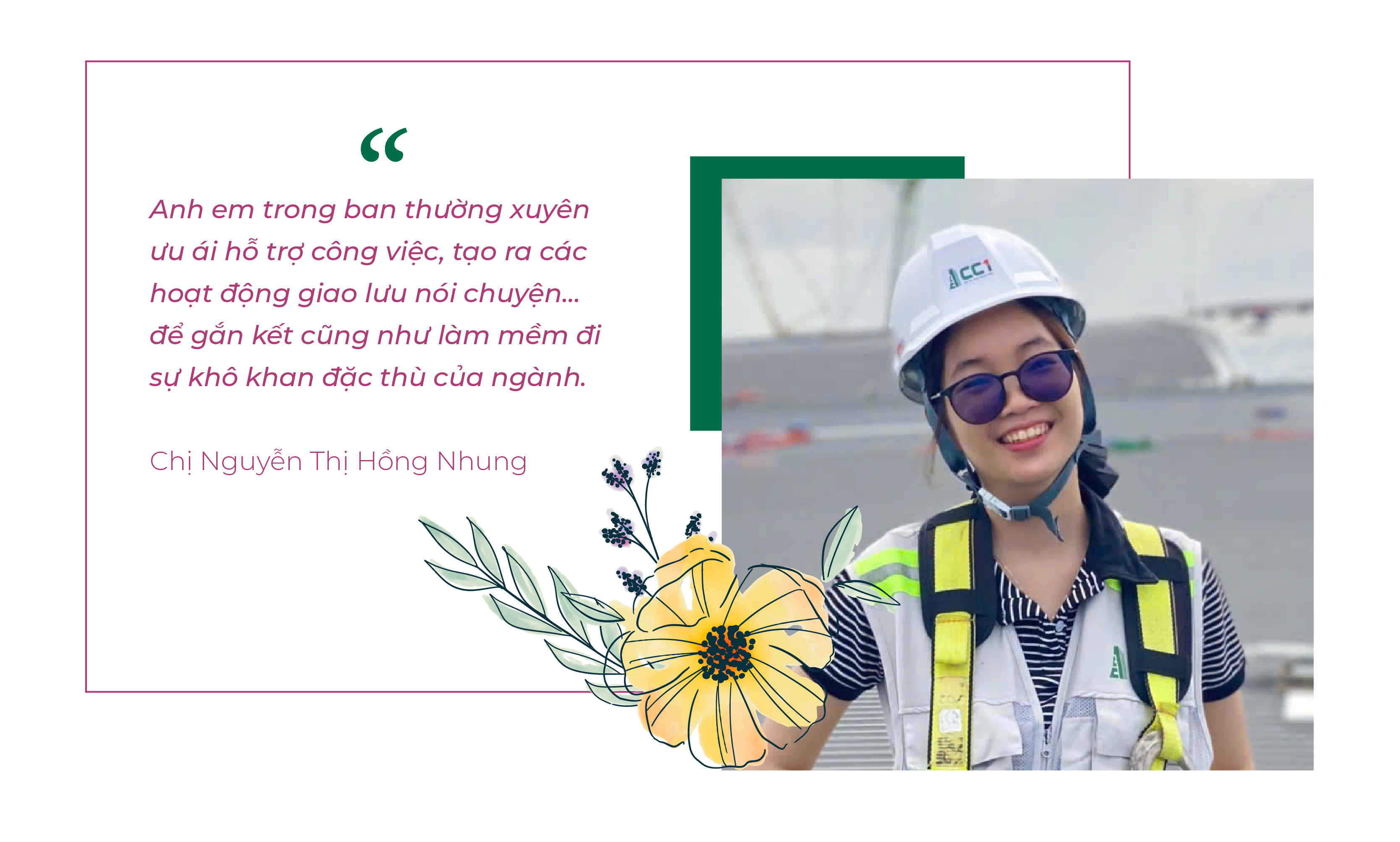 Những cô gái bản lĩnh tại CC1 không chỉ mang tinh thần thép hoàn thành xuất sắc mọi nhiệm vụ được giao trên công trường, mà còn là người giàu cảm xúc, mang nguồn năng lượng tươi trẻ được thắp lên giữa công trình gió bụi.