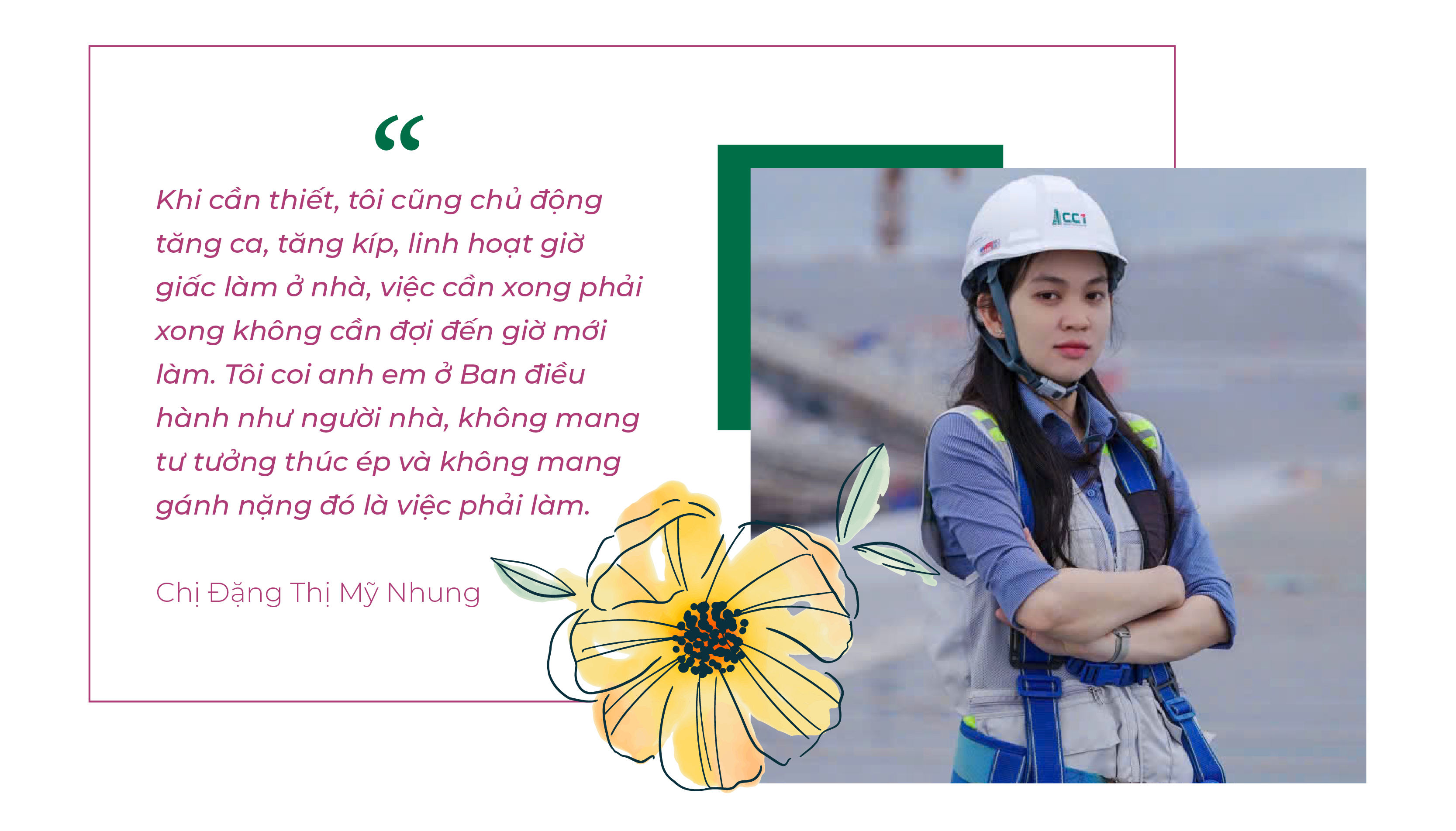 Trong không gian văn phòng chất đầy giấy tờ, bàn ghế xếp gọn theo từng dãy, thấp thoáng giữa chỗ ngồi anh em kỹ sư, quản lý… là những bóng hồng mang tinh thần thép. Đảm nhiệm các vị trí từ kế toán, thư ký dự án, kỹ sư QS, kỹ sư HSE, nhân viên tạp vụ, chị nuôi… tại gói thầu 5.10 và 4.8 ở sân bay Long Thành, chị em phụ nữ trong Đại gia đình CC1 cũng là những mảnh ghép không thể thiếu để đưa dự án về kịp tiến độ 19/12 tới.